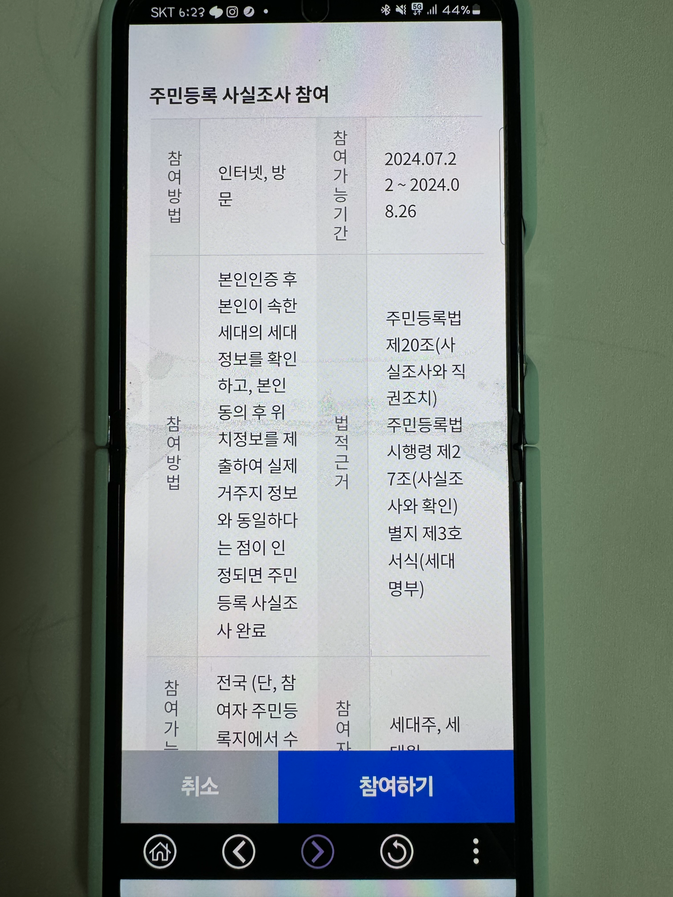 주민등록 사실조사는 비대면 조사, 방문 조사의 두 가지 방법으로 진행됩니다. '정부 24' 어플을 통해서 간편하게 비대면 조사에 참여 가능하고, 이후 비대면 조사에 참여하지 못한 세대의 경우 방문 조사 기간에 조사원이 방문하여 직접 사실조사를 진행합니다. 다만, 비대면 사실조사에 참여했더라도 중점조사 대상이 포함된 세대에 대해서는 방문 조사가 진행된다고 합니다.
