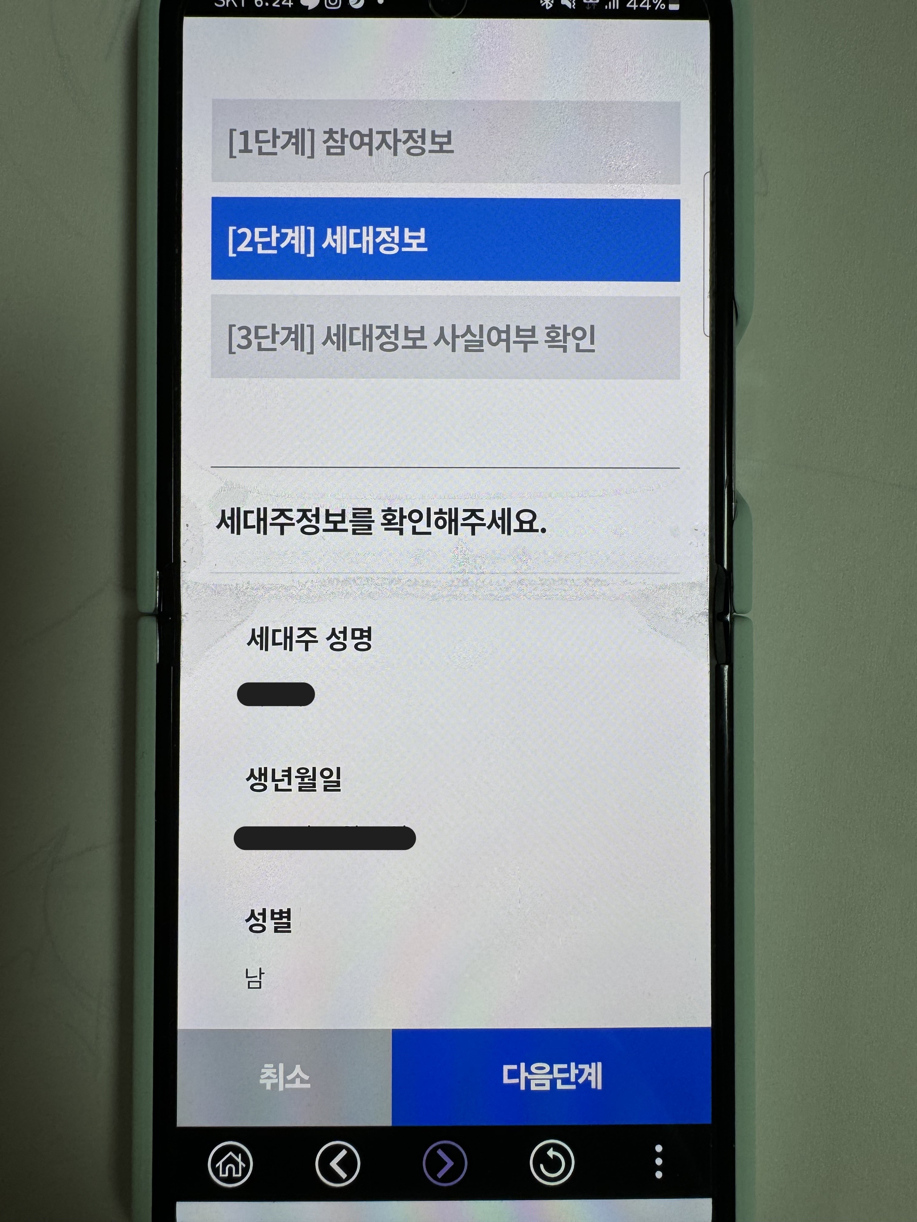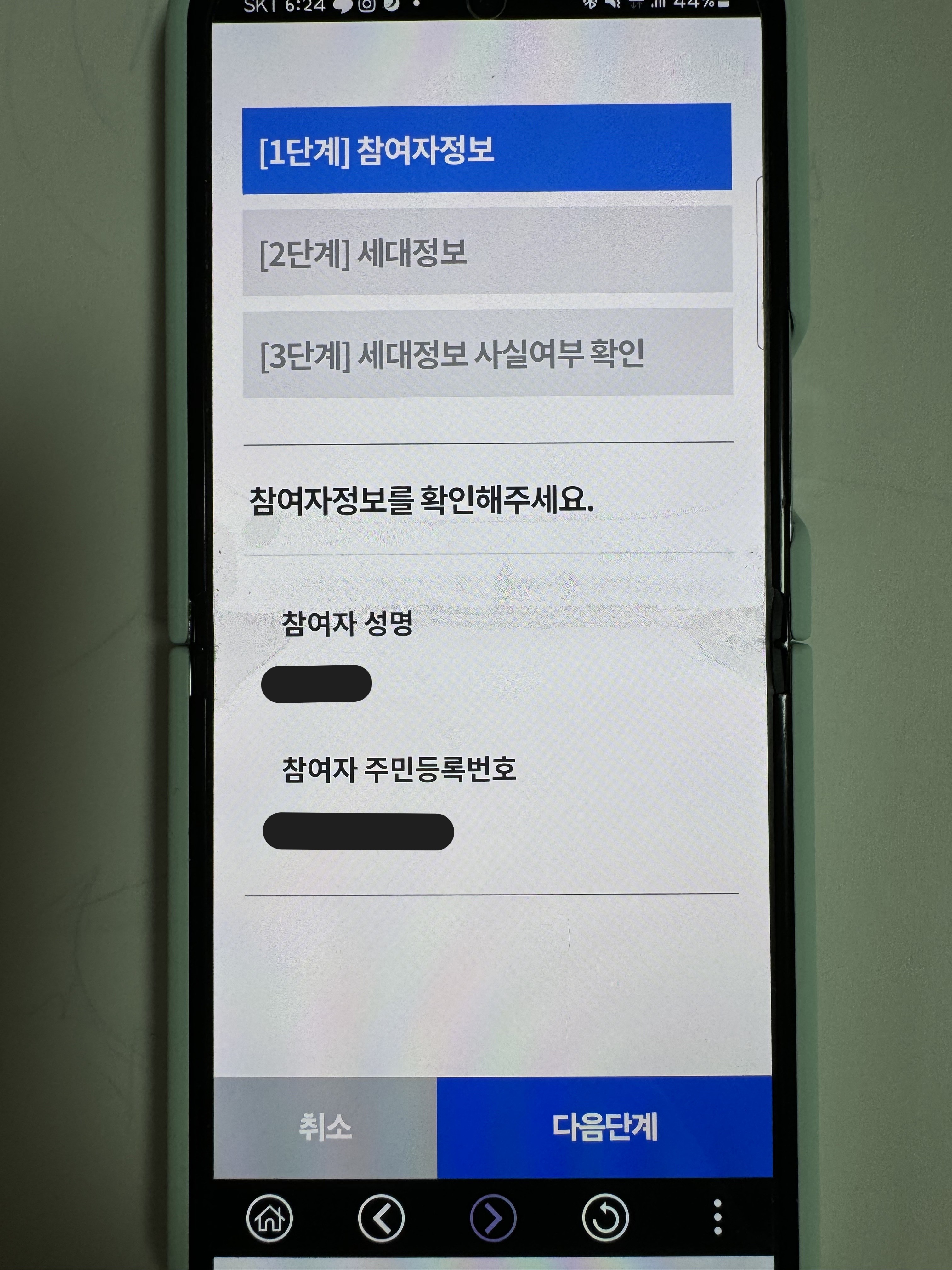 참여하기 버튼을 클릭하면 [1단계] 참여자 정보 확인하기가 나옵니다. 어플을 실행해서 조사에 참여하는 사람이 참여자가 되므로 성명과 주민등록번호 확인 후 다음단계를 클릭합니다. [2단계] 세대정보는 해당 세대에 거주하는 구성원의 정보가 보입니다. 보이는 정보가 맞는지 확인 후 다음단계를 클릭합니다.