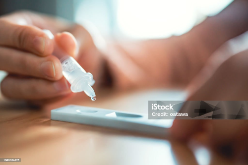 3. 검체추출액을 자가키트의 구멍 안에 3~4 방울 정도 떨어뜨리고, 약 15분 후에 검사 결과를 확인 합니다.