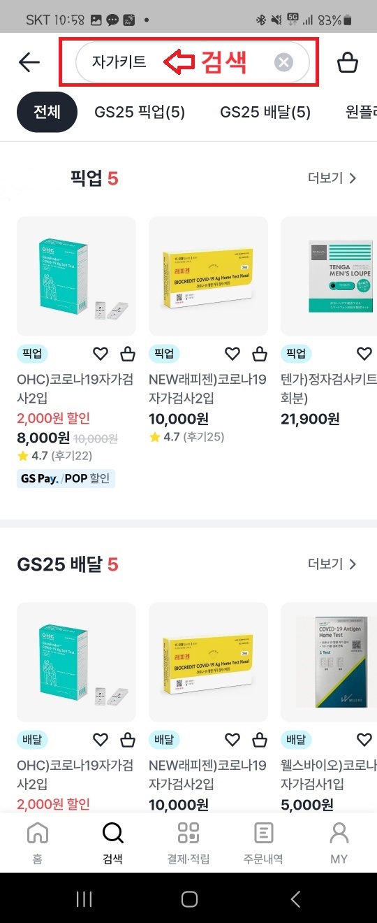 어플에 로그인을 하면 어플 하단에 돋보기 모양의 검색을 클릭 합니다. 이후에 검색하는 창에 '자가키트'로 검색하면 구입가능한 코로나 자가키트 종류와 금액이 확인 가능합니다.